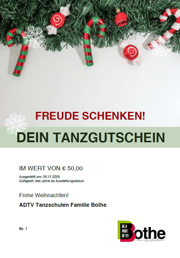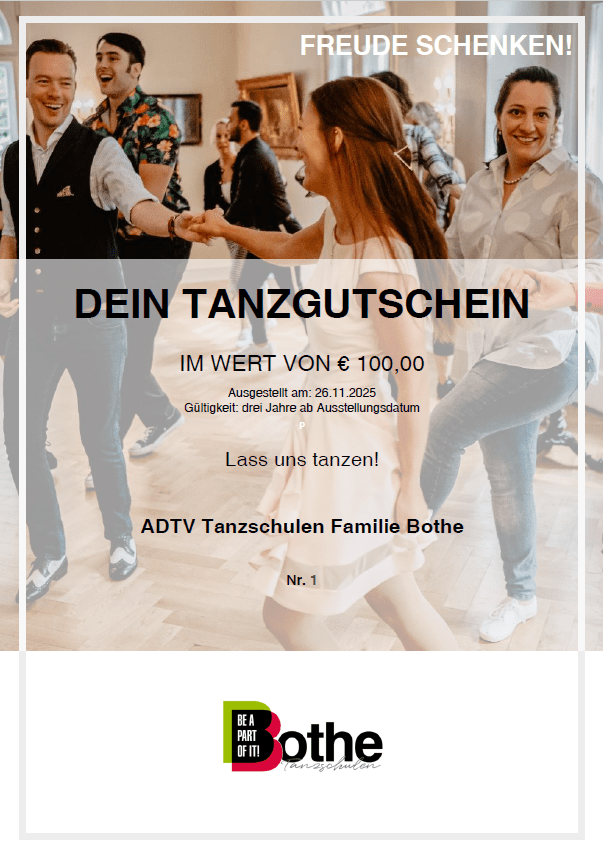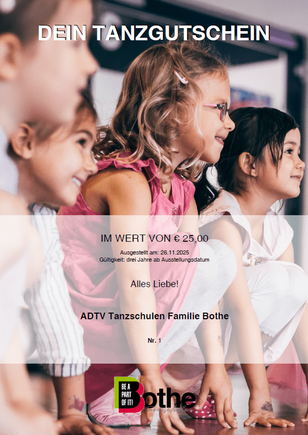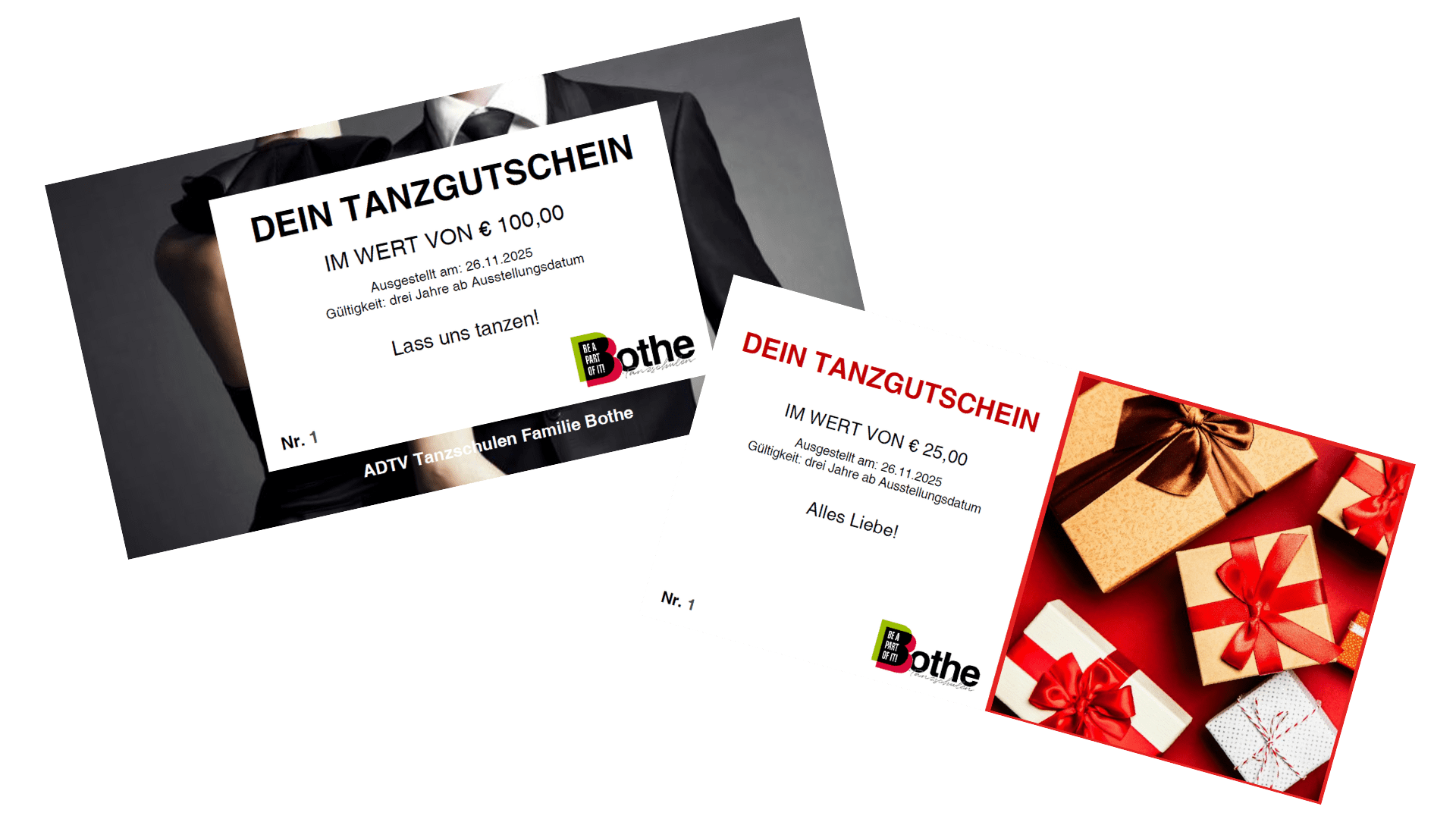 ADTV-Tanzschulen Familie BotheTanz-Gutscheine als Geschenk zu besonderen Ereignissen, Geburtstagen, Konfirmationen und mehr sind die beste Wahl. Sie gelten für unser gesamtes Angebot in allen Tanzhäusern (ausgenommen Privat-/ Einzelstunden).